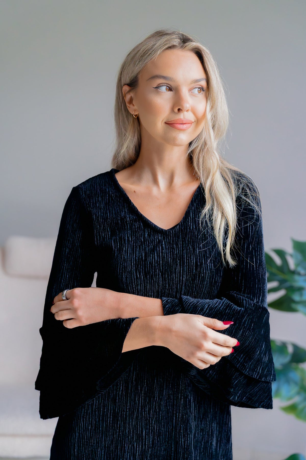 Step into the spotlight with the Twilight Elegance Dress, featuring shimmering black glitter and playful bell sleeves that dance with every move. The layered short design and flattering V-neck strike the perfect balance between flirty and chic, while long sleeves keep it effortlessly stylish for any occasion. Sparkle your way through the night!