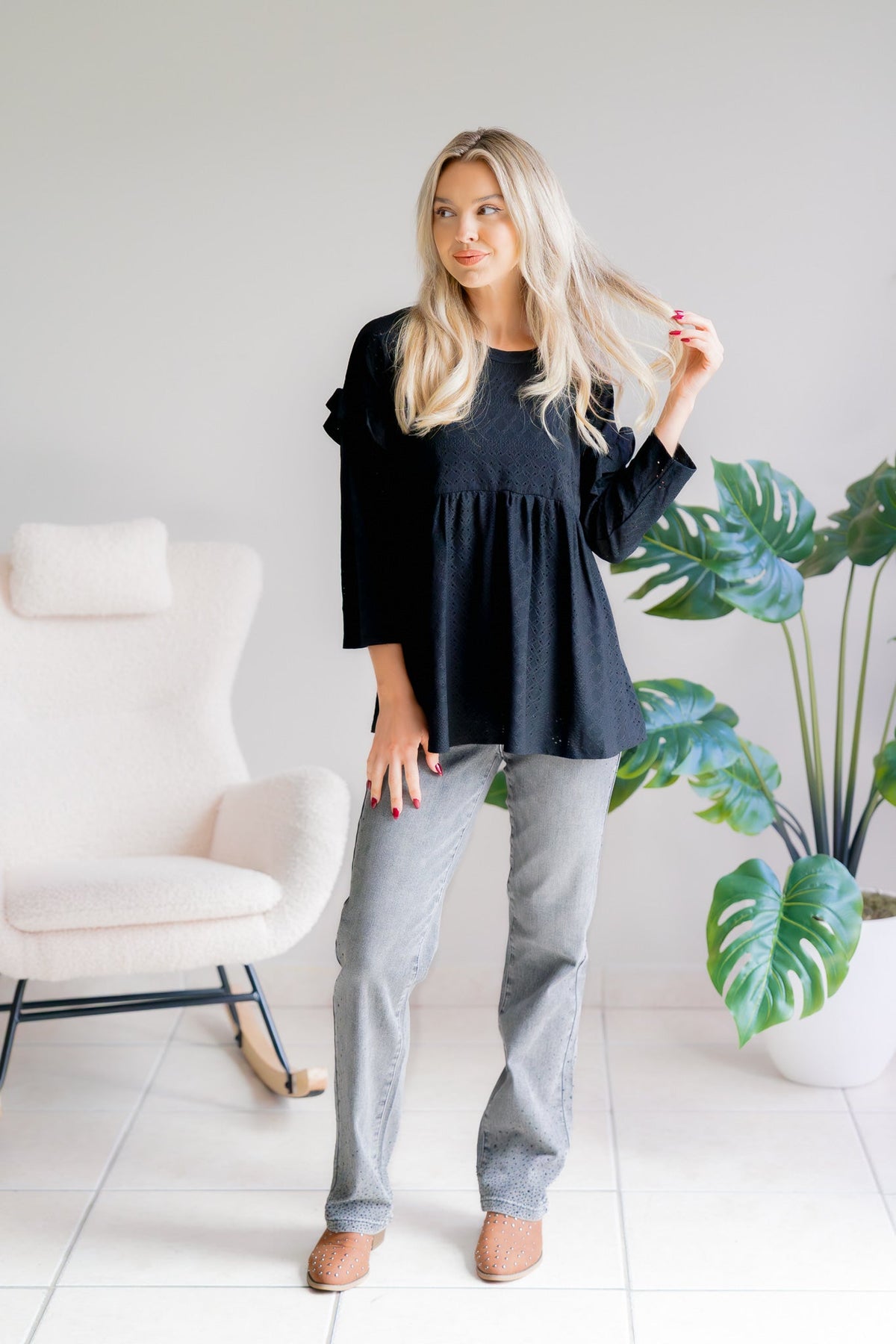 Capture everyone's attention with the After Dark Elegance Babydoll, featuring charming 3/4 length sleeves and delicate eyelet fabric. Easily pair it with any colorful piece to create a fun and unique outfit. This relaxed-fit top offers a round neckline, ruffled sleeves, and a flirty peplum hem for a playful touch.