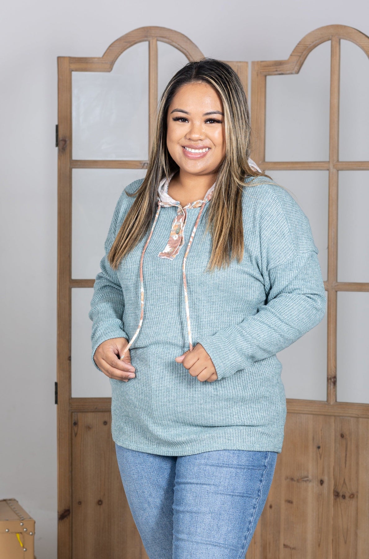 This turquoise hoodie featuring a multi-colored white patterned hood and strings. Keep warm while looking cool in this pullover.