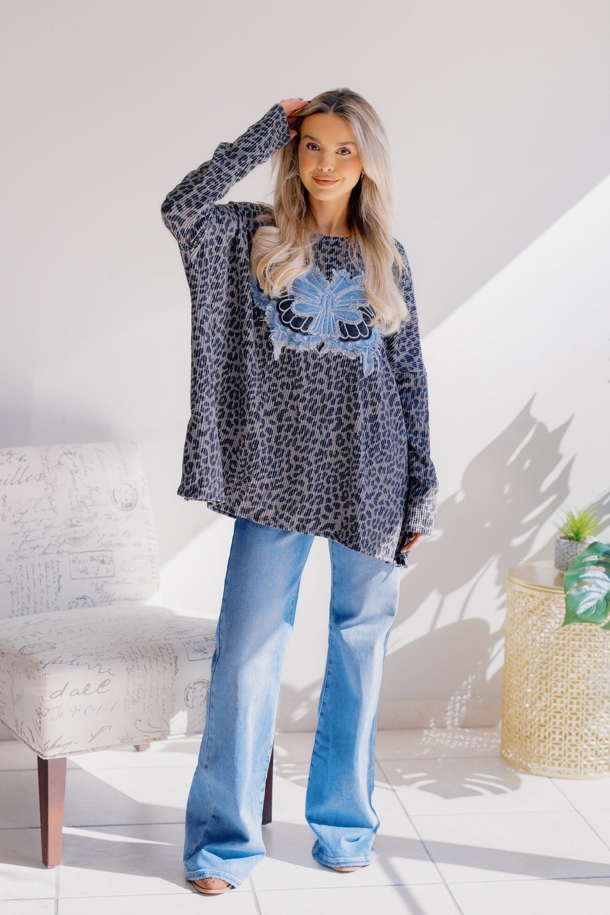 Embrace your wild side with the Ocean Wings Top, featuring a playful black and gray leopard print combined with delicate butterfly accents. Lightweight and designed for a loose fit, this top offers effortless comfort and a breezy feel perfect for any casual adventure. Let your style take flight while staying cool and confident all day long.
